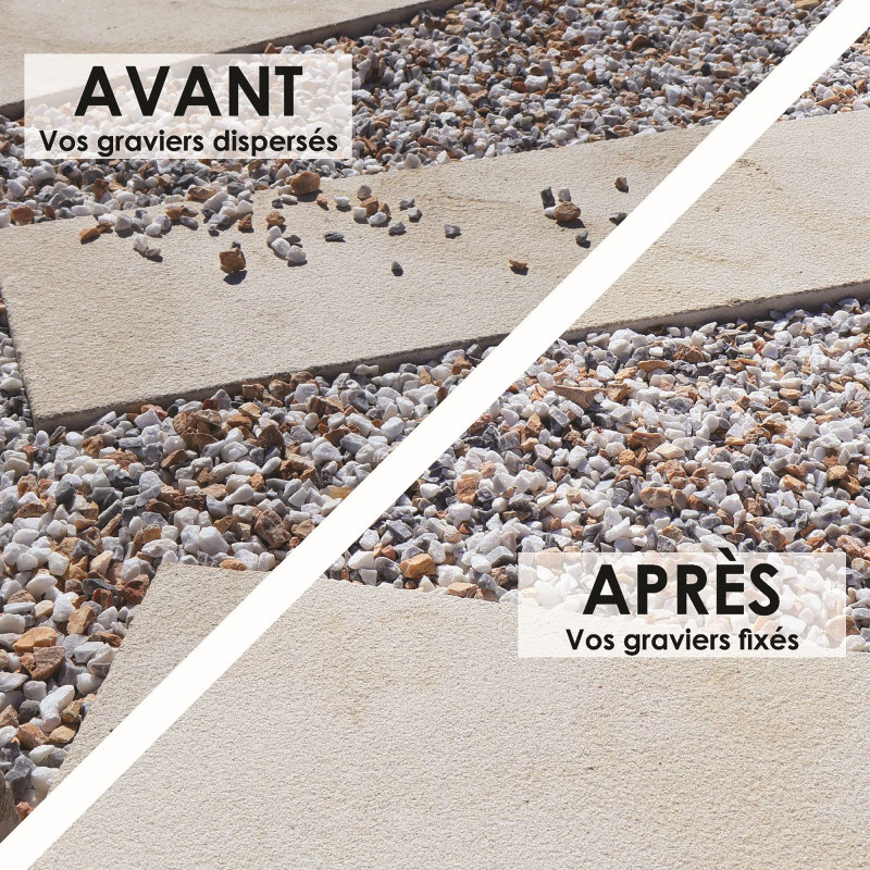 Le surdosage peut laisser apparaître un jaunissement sur vos granulats clairs. Le produit doit être stocké à l’abri du gel et des UVs, entre 5°C et 25°C.